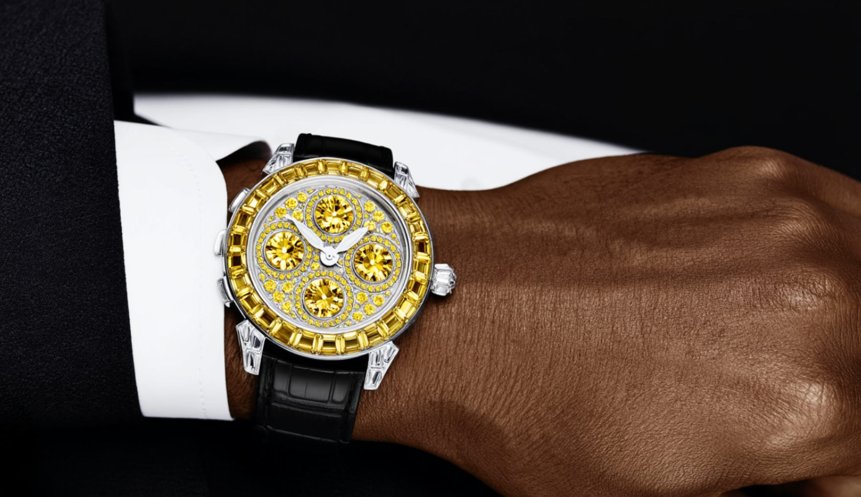 Radiant with the fire of fancy vivid yellow diamonds, the 4 Central is a rare fusion of fine diamonds and haute horlogerie. Its four central masterpieces rotate in a graceful ballet of light, framed by an 18K white gold case and a bezel of baguette-set yellow diamonds.