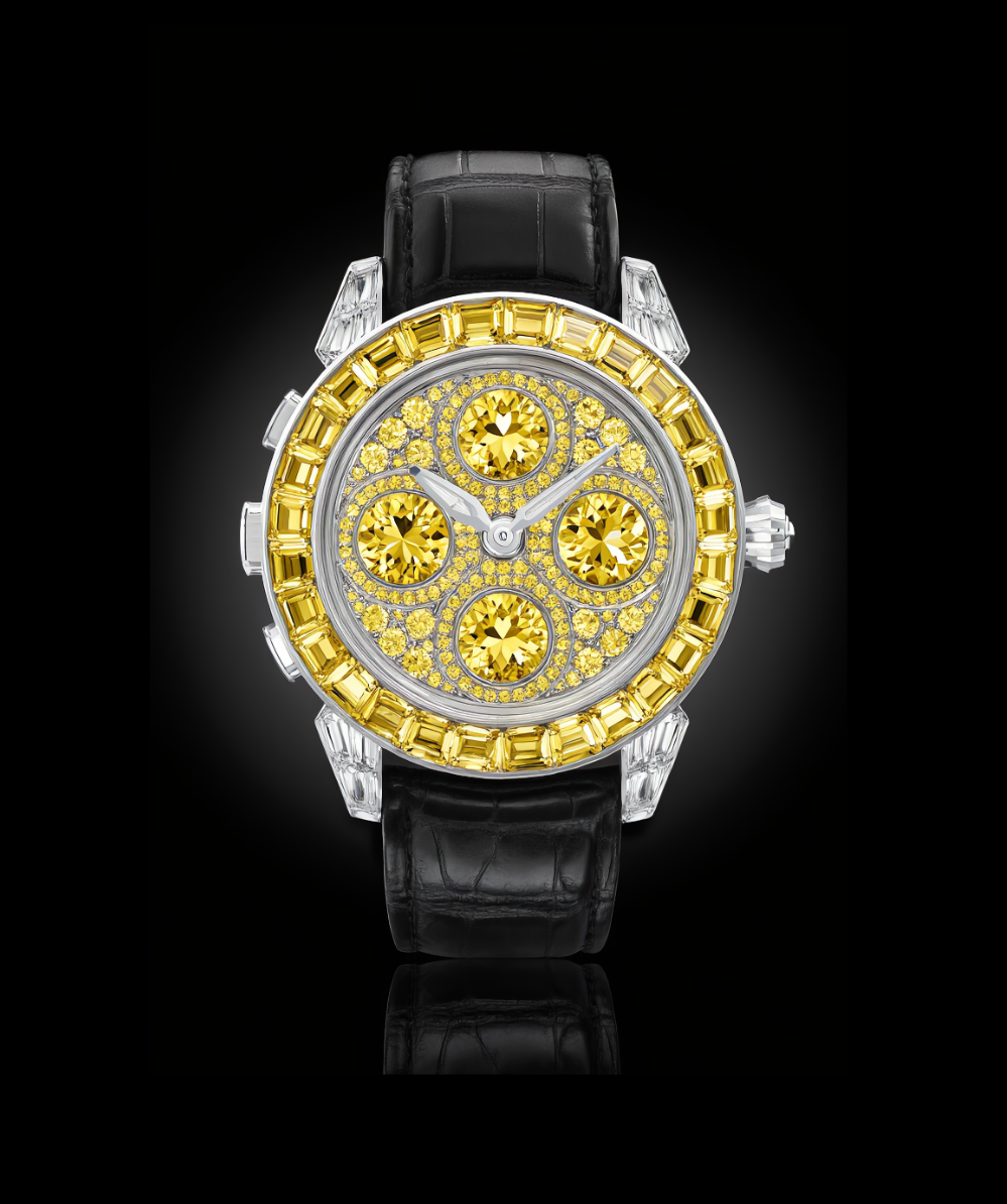 Radiant with the fire of fancy vivid yellow diamonds, the 4 Central is a rare fusion of fine diamonds and haute horlogerie. Its four central masterpieces rotate in a graceful ballet of light, framed by an 18K white gold case and a bezel of baguette-set yellow diamonds.