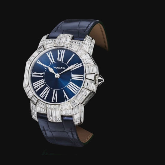 The Elythar is a striking statement of male opulence, defined by its bold diamond-set case that radiates with unmatched brilliance. Each baguette-cut diamond is meticulously placed, creating an architecture of light around the rich sunburst dial. With its commanding presence and refined alligator strap, this timepiece transcends functionality to become a statement symbol of power, prestige, and fine diamond mastery.