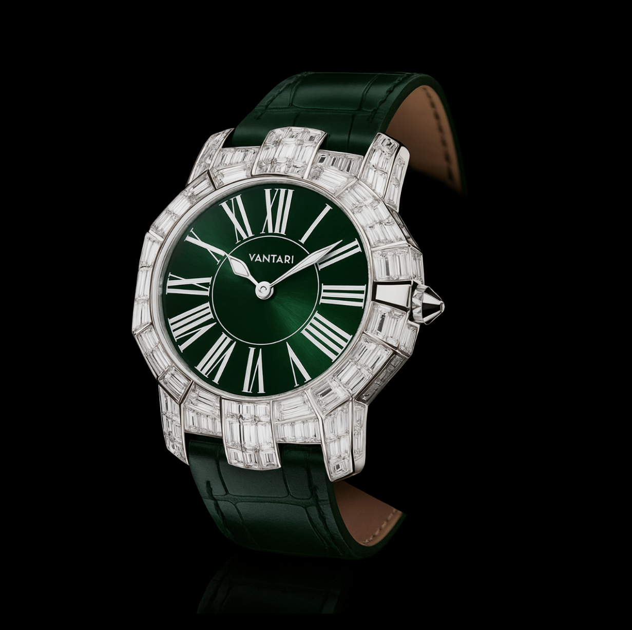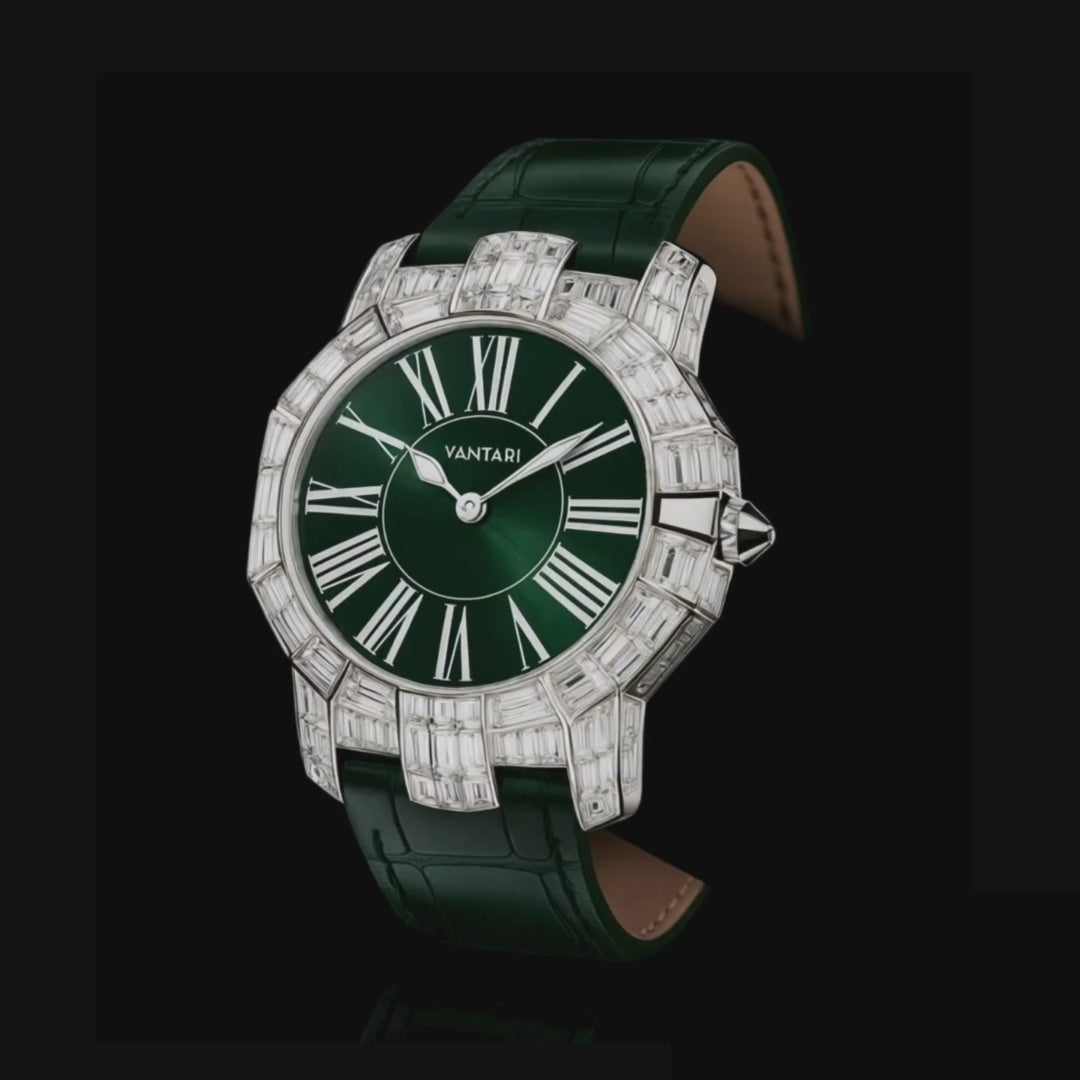The Elythar is a striking statement of male opulence, defined by its bold diamond-set case that radiates with unmatched brilliance. Each baguette-cut diamond is meticulously placed, creating an architecture of light around the rich sunburst dial. With its commanding presence and refined alligator strap, this timepiece transcends functionality to become a statement symbol of power, prestige, and fine diamond mastery.